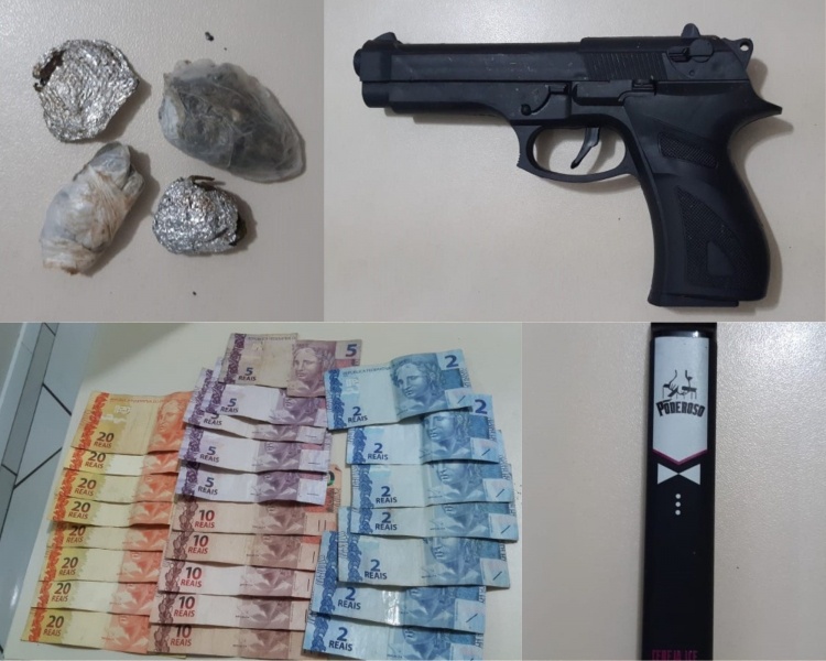 Durante as buscas, uma guarnição se deparou com dois suspeitos caminhando pela Avenida Rene Frey, sentido bairro Portal. Após serem abordados e revistados, os policiais localizaram uma certa quantia em dinheiro, um cigarro eletrônico e um simulacro (imitação) de arma de fogo.