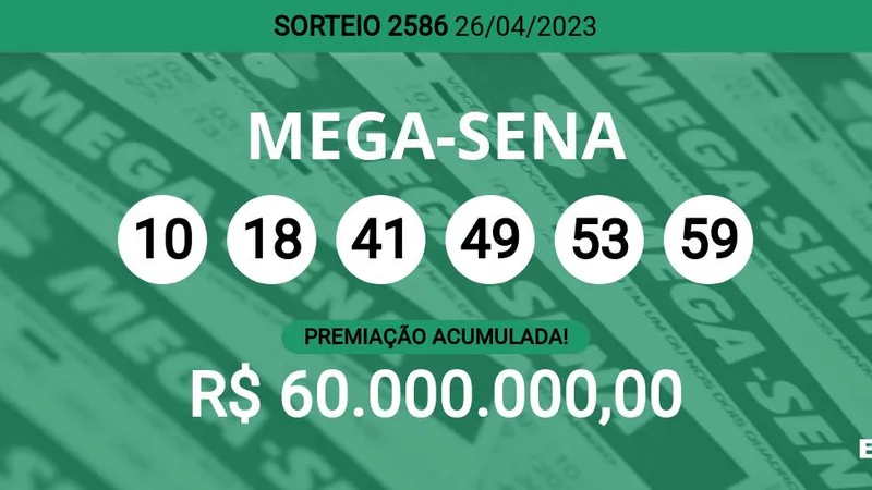 Foram sorteados na noite desta quarta-feira, dia 26, os números do concurso 2.586 de Mega-Sena. Ninguém acertou as seis dezenas e o prêmio estimado pela Caixa para o próximo sorteio é de R$ 60 milhões. Confira os números: 10 – 18 – 41 – 49 – 53 – 59. O próximo sorteio da Mega será no sábado, dia 29.