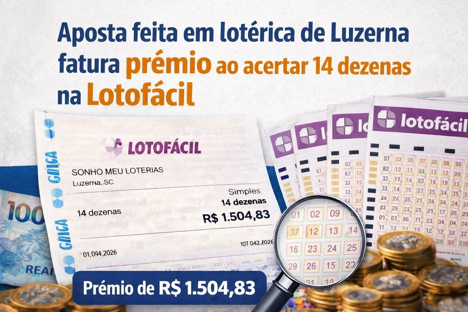 Uma aposta registrada em Luzerna foi destaque no sorteio da Lotofácil realizado no último sábado, dia 11 de abril de 2026. O jogo, feito na lotérica Sonho Meu Loterias, acertou 14 dezenas e garantiu um prêmio de R$ 1.504,83.