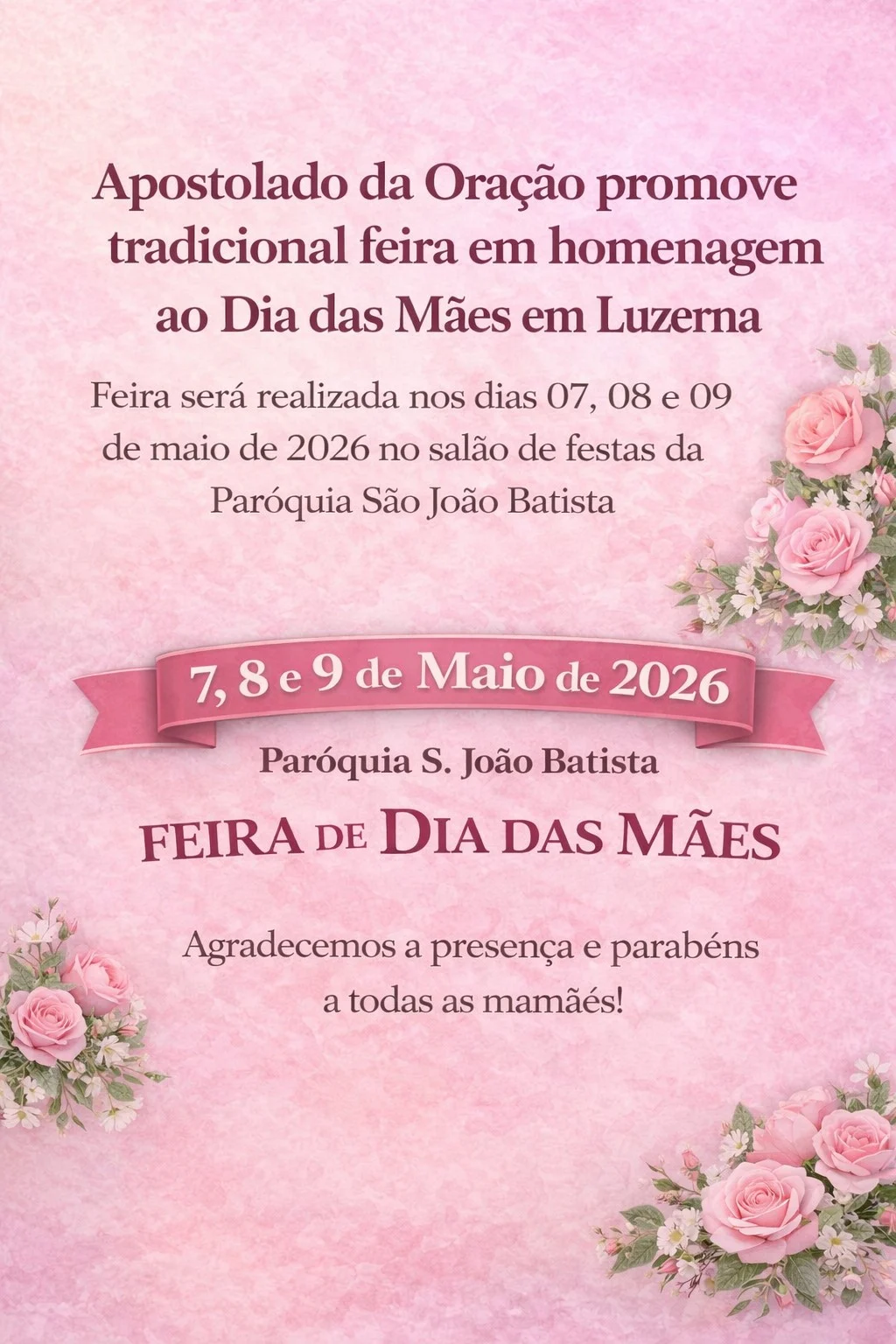 A Paróquia São João Batista de Luzerna, por meio do Apostolado da Oração, realizará mais uma edição da tradicional feira em homenagem ao Dia das Mães. O evento acontece entre os dias 7 e 9 de maio de 2026, no salão de festas da paróquia, reunindo a comunidade em um momento de fé, confraternização e solidariedade.