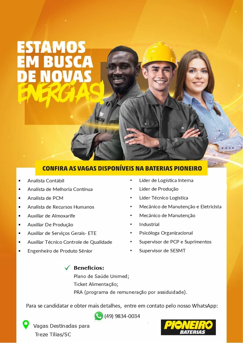 Há mais de 35 anos oferecendo a melhor energia, a Baterias Pioneiro está recrutando novos talentos para integrar sua equipe!