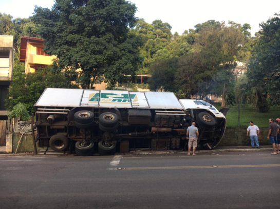 O acidente ocorreu na manhã desta sexta-feira (10) por volta das 07h00min, quando um caminhão desgovernado desceu o acesso da SC 453, atravessou pela rótula, passou pela ponte e tombou na Avenida Presidente Nereu Ramos.