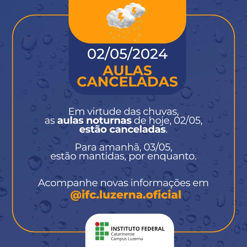 A Direção do IFC – Campus Luzerna informa que foram canceladas as aulas noturnas de hoje, 02/05/2024.