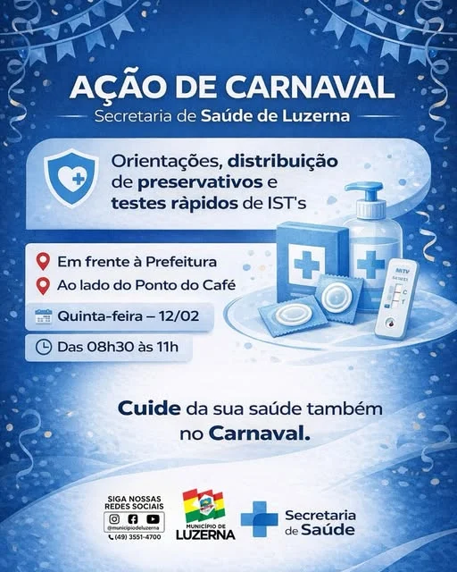 A Secretaria de Saúde de Luzerna realizará uma ação especial de prevenção durante o período de Carnaval, com orientações, distribuição de preservativos e realização de testes rápidos de IST’s.