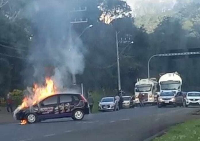 Durante o atendimento o trânsito ficou bloqueado. Após a retirada do veÃculo da pista, o fluxo de veÃculos foi normalizado. Ainda, foi feita a limpeza da rodovia no ponto do incêndio, sendo que foram utilizados cerca de 400 litros de água para o combate e limpeza de pista e dois litros de LGE.
