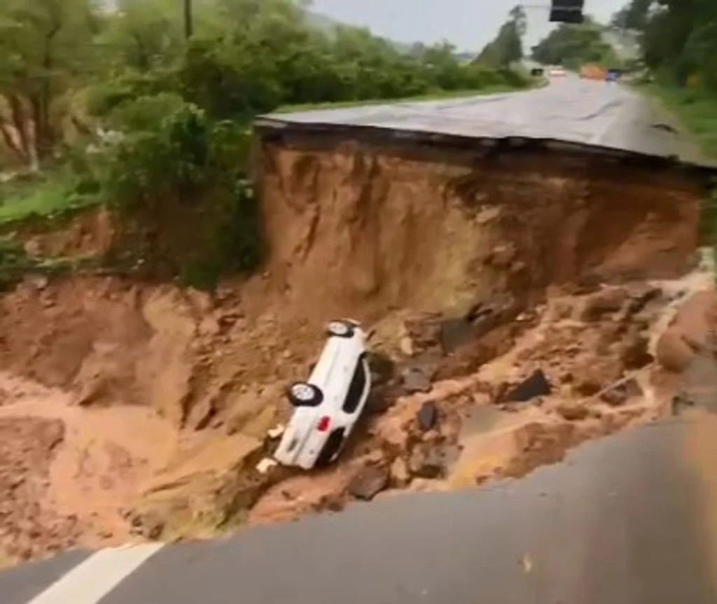 Carro é ‘engolido’ por cratera gigante que se abriu na BR-470