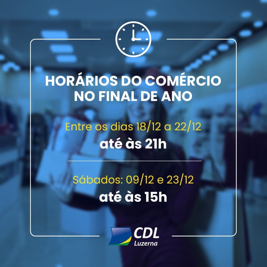 A diretoria da Câmara de Dirigentes Lojistas de Luzerna (CDL) já definiu o calendário de funcionamento do comércio durante o mês de dezembro de 2023. As lojas associadas farão horário especial de atendimento com objetivo de facilitar as compras para o Natal e movimentar a economia local.