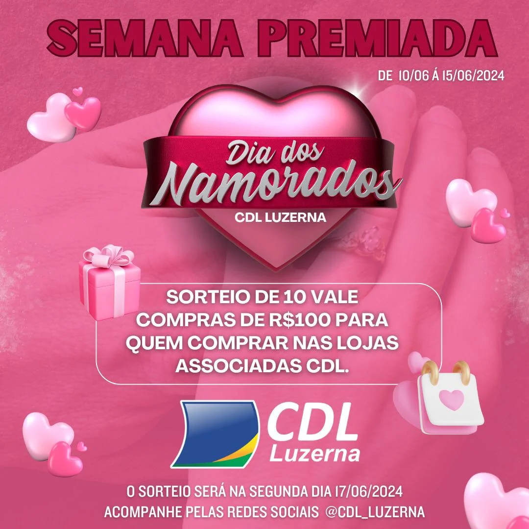 A CDL (Câmara de Dirigentes Lojistas) de Luzerna lançou uma campanha especial para o Dia dos Namorados, intitulada “Semana Premiada Dia dos Namorados”. Essa iniciativa visa estimular o comércio local, oferecendo aos consumidores uma oportunidade única de ganhar prêmios e aproveitar ofertas exclusivas.