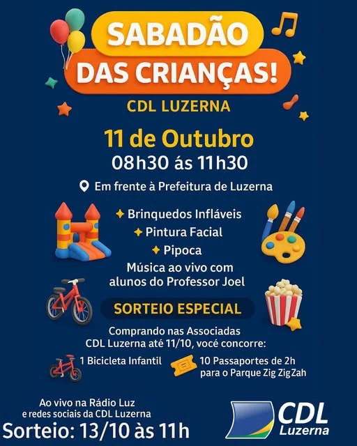 Sorteio: 13/10 às 11h, ao vivo na Rádio Luz e nas redes sociais da CDL Luzerna