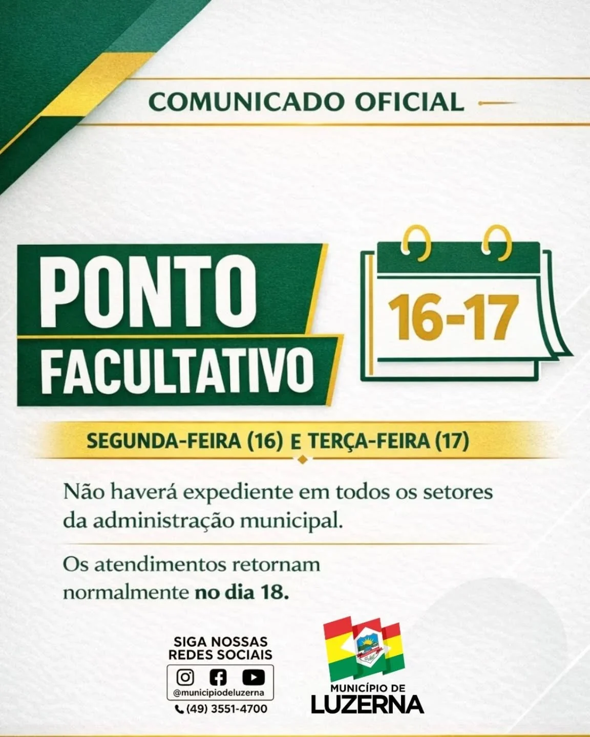 Em razão do Carnaval, a Prefeitura de Luzerna informa que segunda-feira (16) e terça-feira (17) de fevereiro de 2026 serão ponto facultativo, não havendo expediente nos setores da administração municipal.