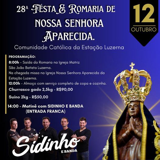 O evento iniciará com a saída da Romaria, na matriz de Luzerna, às 8 horas. Logo após a procissão, missa na Igreja Nossa Senhora Aparecida, na Estação Luzerna.