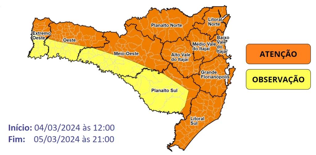 Após um final de semana com predomínio de tempo firme e calor na maioria das regiões do estado, o tempo começa a apresentar mudanças neste início de semana. Entre a segunda-feira (04) e a terça-feira (05), o avanço de uma frente fria por SC deve favorecer a formação de temporais isolados com chuva pontualmente intensa acompanhada de raios, fortes rajadas de vento e eventual precipitação de granizo. A instabilidade devem avançar entre o final da manhã e início da tarde desta segunda (04) pelas áreas de divisa do estado com o RS, incluindo áreas do Grande Oeste, Planalto Sul e Litoral Sul. No decorrer da tarde e noite, com o deslocamento do sistema para norte, a condição para chuva intensa e temporais se espalha por todas as áreas, atingindo áreas da Grande Florianópolis, Vale do Itajaí, Planalto Norte e Litoral Norte. O risco é moderado nas áreas em amarelo e alto nas áreas em laranja para alagamentos e enxurradas pontuais, destelhamentos e danos à rede elétrica. Ao longo da terça (05), o deslocamento do sistema pelo estado segue favorecendo chuva, que ainda pode ser intensa e vir acompanhada de trovoadas, especialmente entre o Meio-Oeste e as áreas litorâneas entre a madrugada e o período da tarde. Com a mudança e intensificação dos ventos para o quadrante sul, associados ao ingresso de ar mais frio na retaguarda da frente fria, sobretudo na terça, as temperaturas apresentam diminuição no estado.