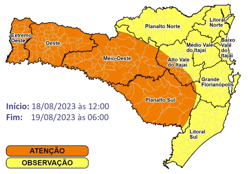 De acordo com o aviso meteorológico do órgão, esses temporais vêm acompanhados de descargas elétricas, rajadas de vento e eventual queda de granizo, iniciando nas áreas de divisa com o Rio Grande do Sul a partir da tarde e avançando para as demais regiões do estado até a manhã do sábado (19).