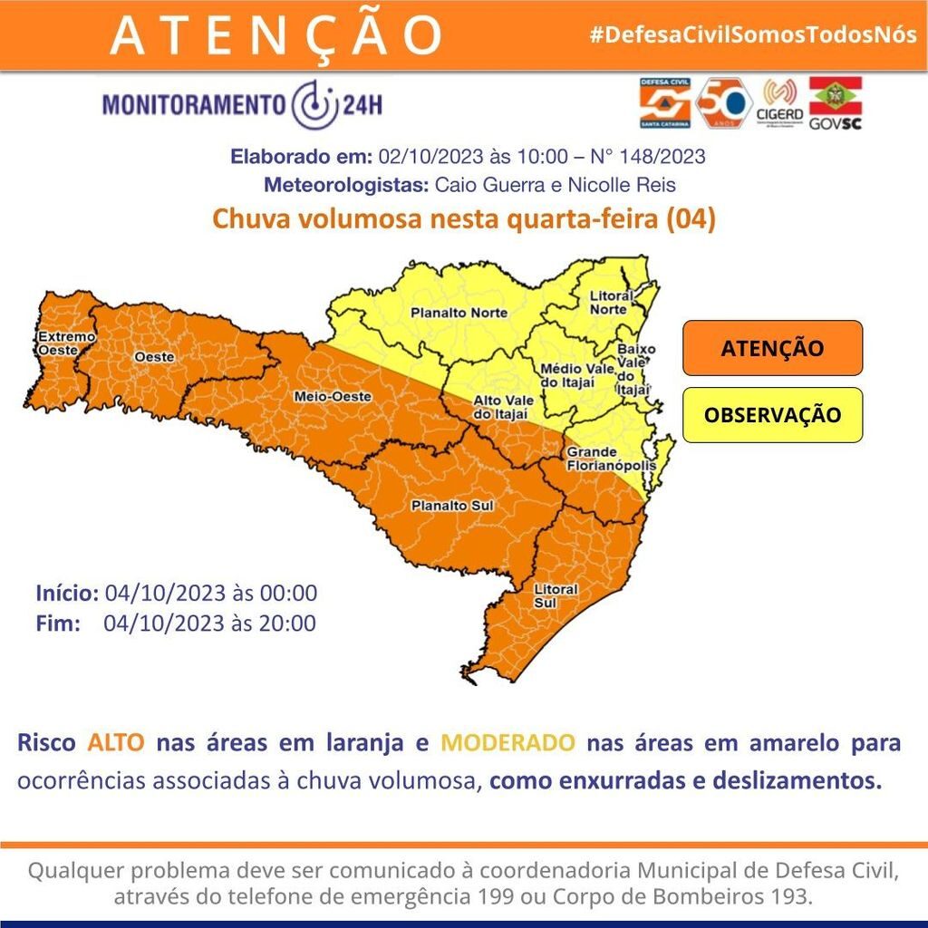 A quarta-feira, dia 03, deverá ser um dia bastante conturbado quanto à chuva. De acordo com o alerta, haverá uma quantidade bastante volumosa no Estado, podendo chegar a 100 milímetros no período de um dia nas áreas em laranja no Mapa (Grande Oeste e parte Sul).