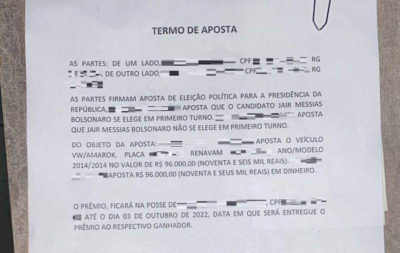 Um “termo de aposta” que circula nas redes sociais detalha o acordo que foi, inclusive, assinado e registrado em cartório pelas partes.