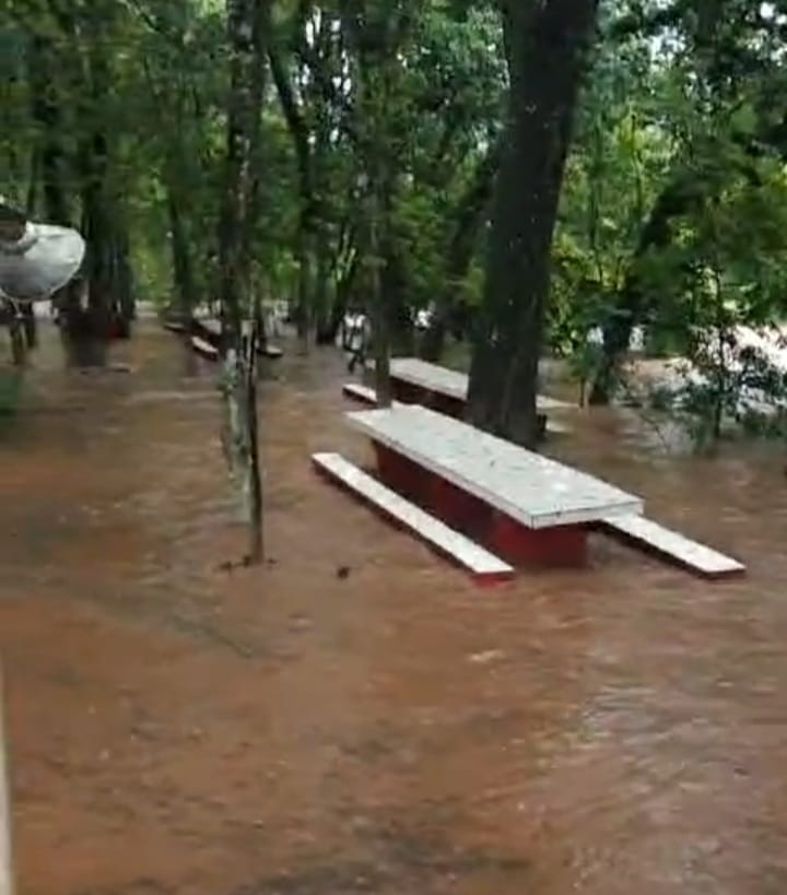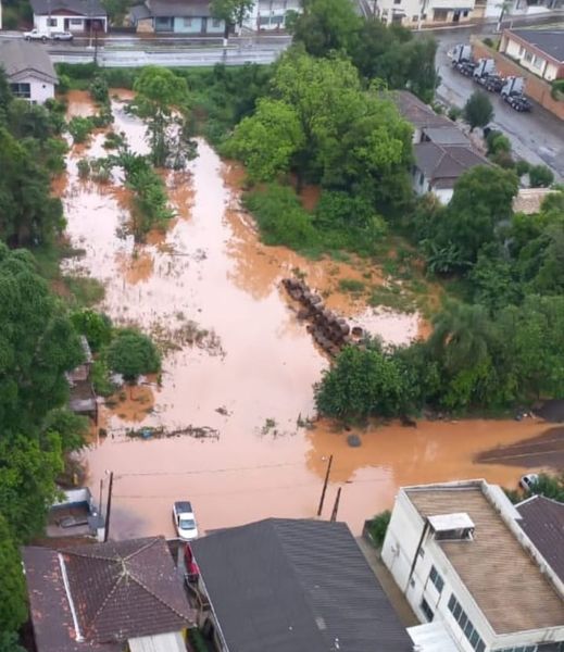 Na Rua Júlio Wasenberger no centro de Luzerna, a galeria pluvial não venceu a vazão da água, e ficou tomada pelas chuvas.