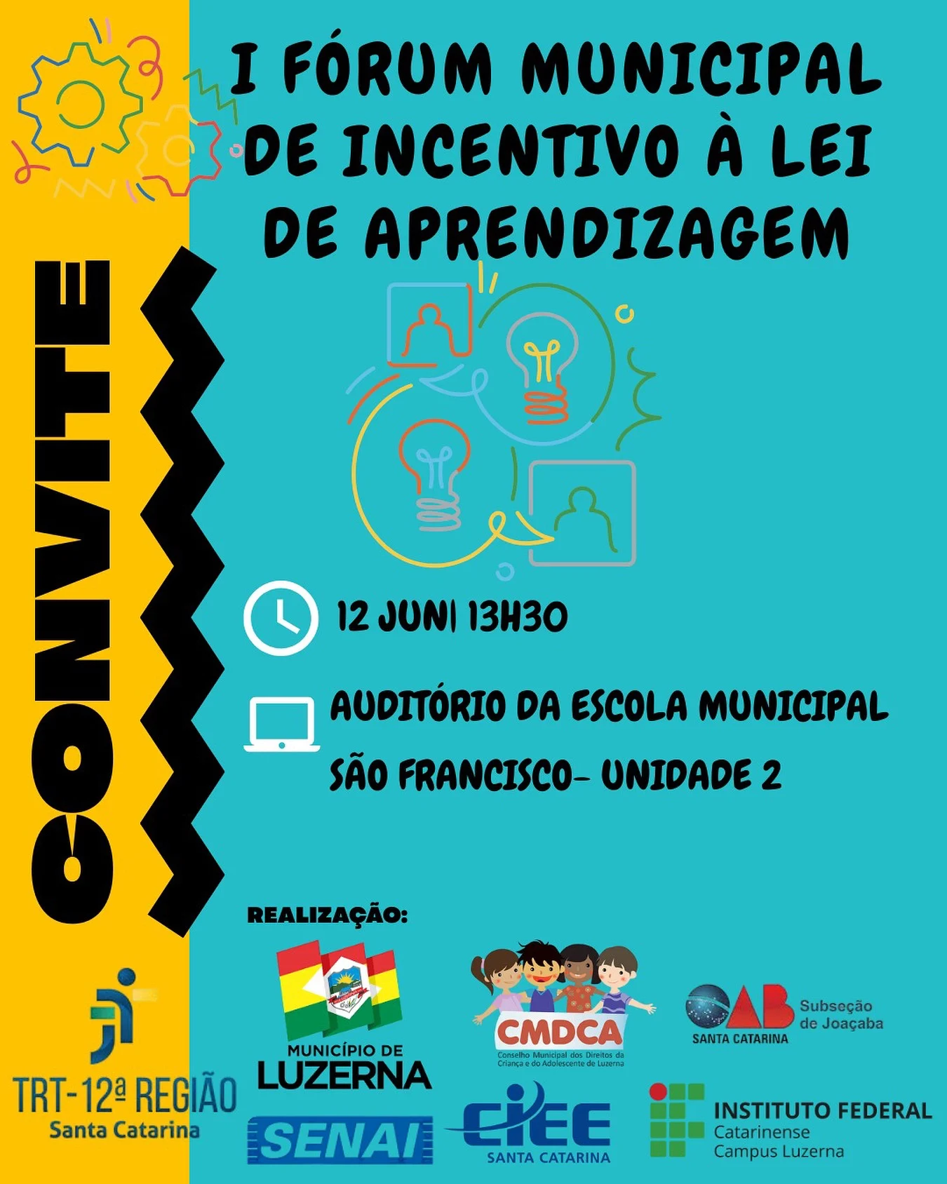 Esse Fórum é uma iniciativa do CMDCA em conjunto com a Vara do Trabalho, CIEE, SENAI, IFC, OAB e secretarias da Administração pública de Luzerna. Tem por objetivo fomentar a Lei de Aprendizagem visando ampliar as oportunidades para os jovens do Município.