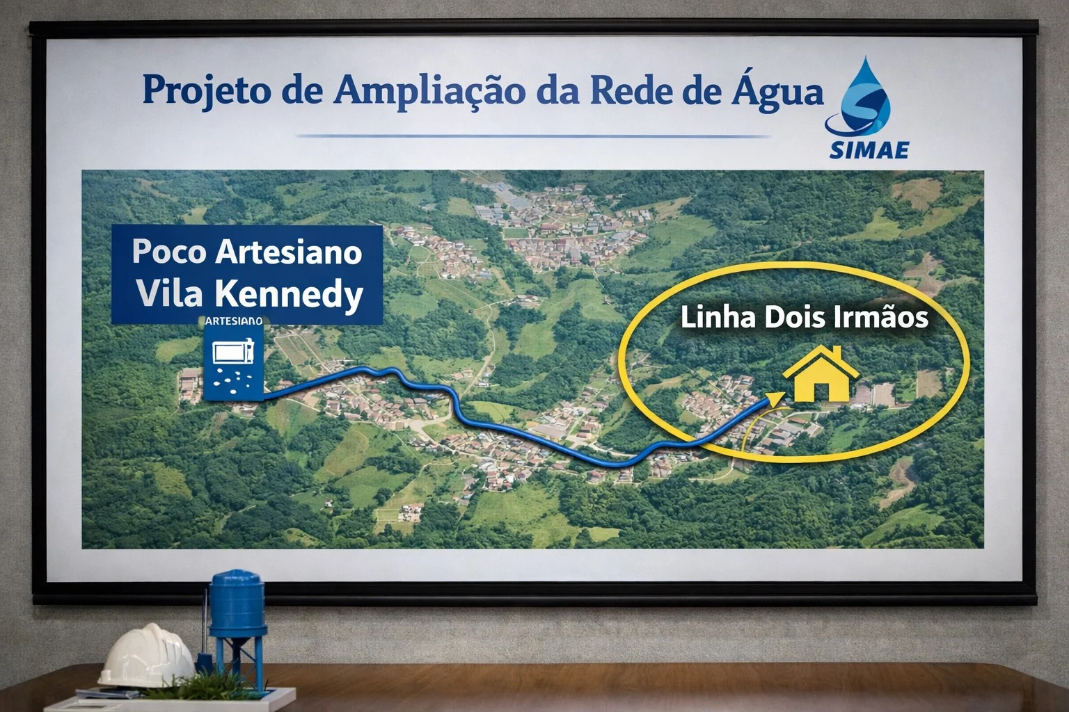Simae apresenta projeto de ampliação da rede de água para a Linha Dois Irmãos em reunião com vereadores O diretor do SIMAE participou de uma reunião com vereadores de Luzerna para apresentar e discutir projetos voltados à melhoria do abastecimento de água e saneamento no município.