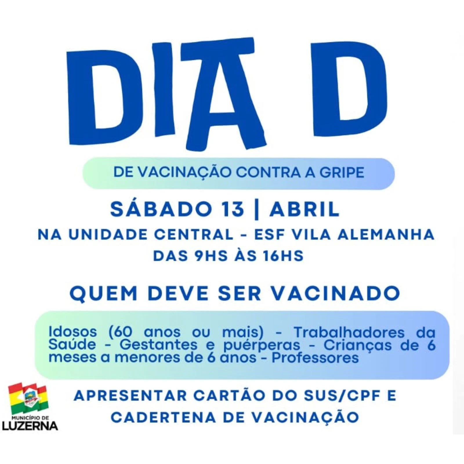 Acontece neste sábado (13) em Luzerna o Dia D de vacinação contra a Influenza (gripe). A mobilização que acontece em todo o país busca garantir a imunização para que dose seja efetiva na proteção contra as cepas dos principais vírus que circulam no Brasil.