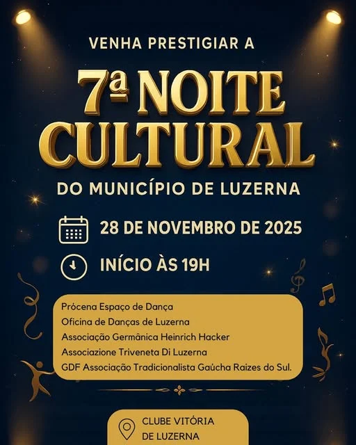 O município de Luzerna se prepara para uma das noites mais esperadas do calendário cultural: a 7ª Noite Cultural, que será realizada no dia 28 de novembro de 2025, a partir das 19h, no Clube Vitória.