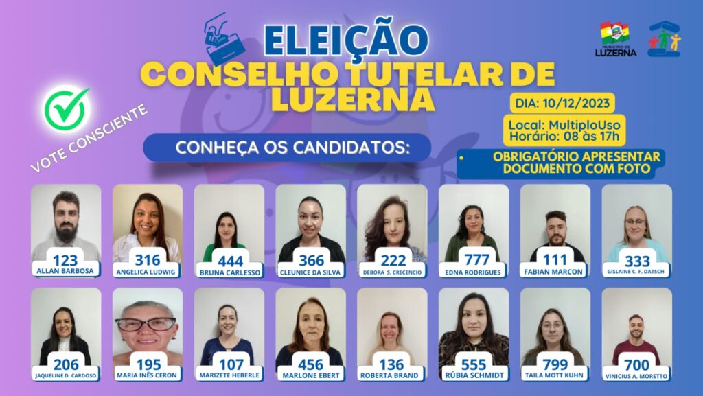 Neste domingo(10) acontece em Luzerna, a eleição suplementar para o conselho tutelar são duas vagas para titulares, e outras cinco para a suplência. A jornada de trabalho para o conselheiro é de 40h semanais.
