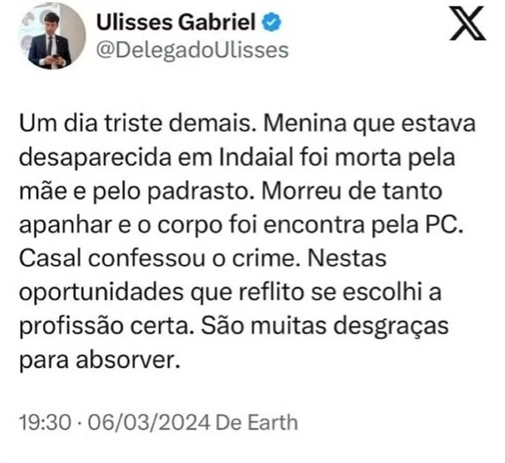 Em uma rede social, o delegado informou que mãe e padrasto, ouvidos ao longo da tarde, confessaram o crime. “Morreu de tanto apanhar”, escreveu.