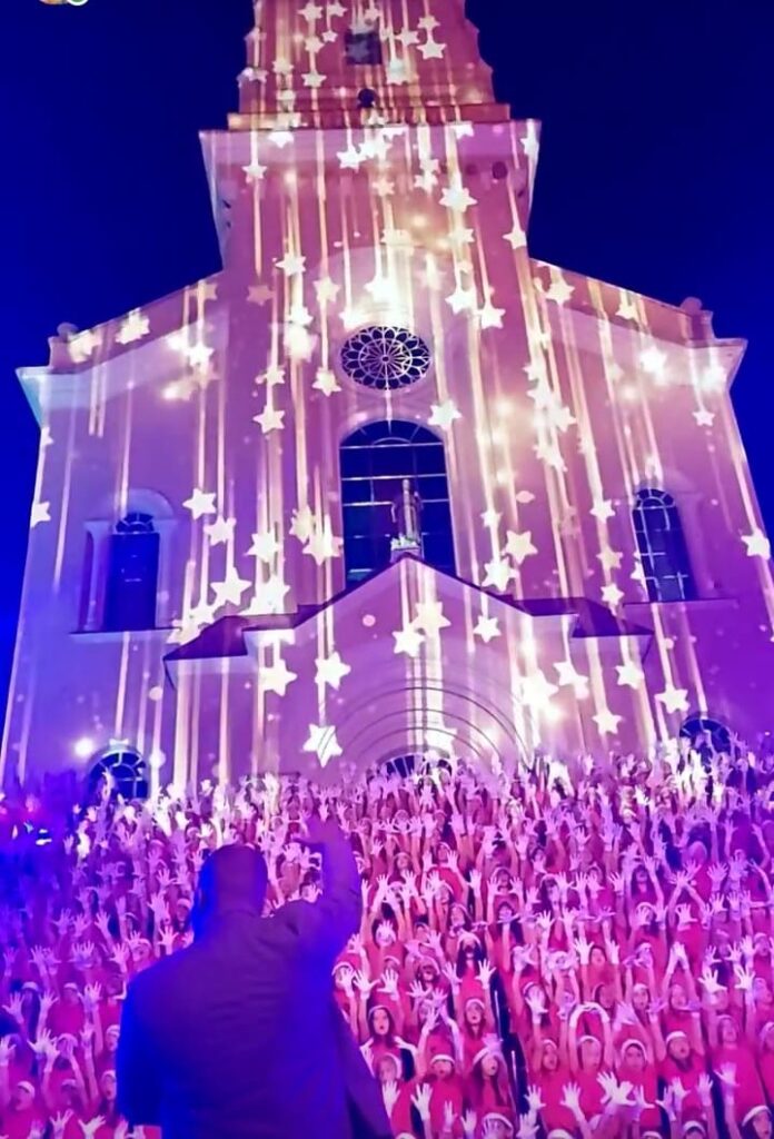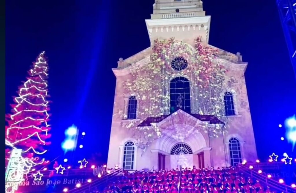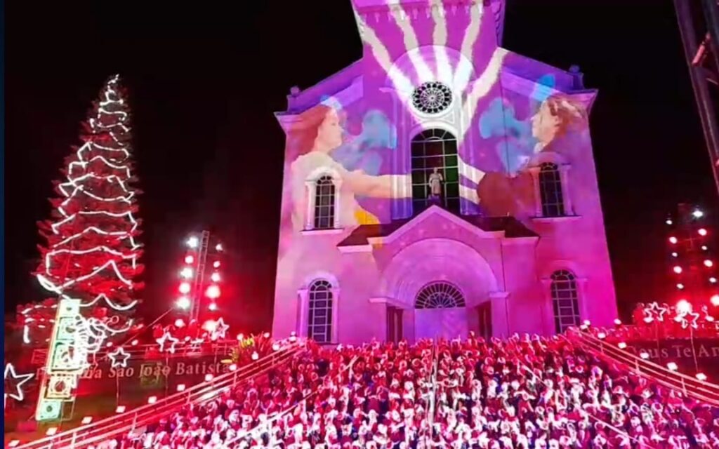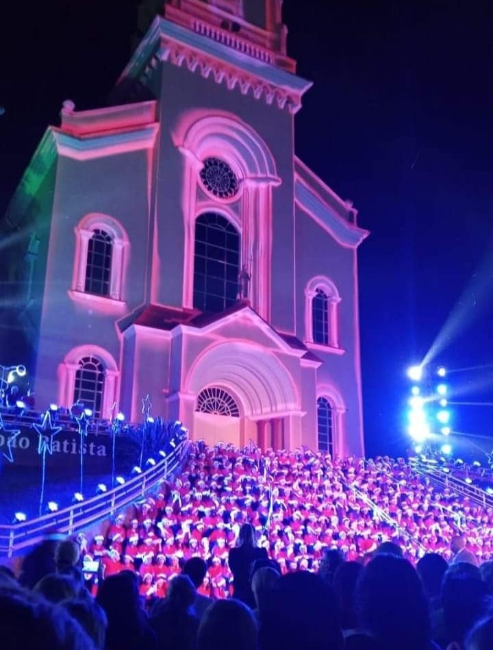 A apresentação foi em frente a Igreja Matriz São João Batista, e contou com 600 crianças da escola municipal São Francisco, que interpretaram canções natalinas com diversas coreografias.