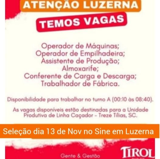 Seleção dia 13 de Novembro no Sine de Luzerna das 13:00h as 15:30h.