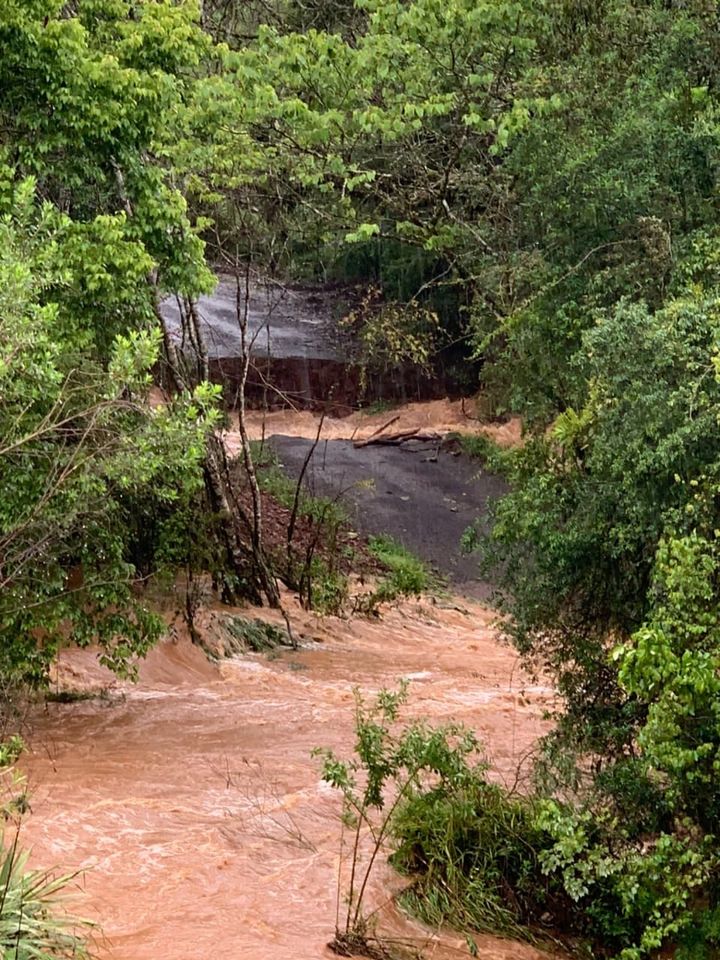 Devido ao grande volume de água do Rio Bom Retiro , a estrutura se rompeu, o motorista nada sofreu, o Rio que passa nessa ponte que caiu é o Rio Bom Retiro que vem de Treze Tilias .
