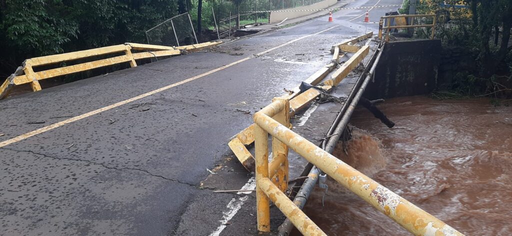 A proteção da ponte foi danificada devido ao grande volume de água que a atingiu. A passagem liga o Bairro Vila Alemanha ao centro da cidade.
