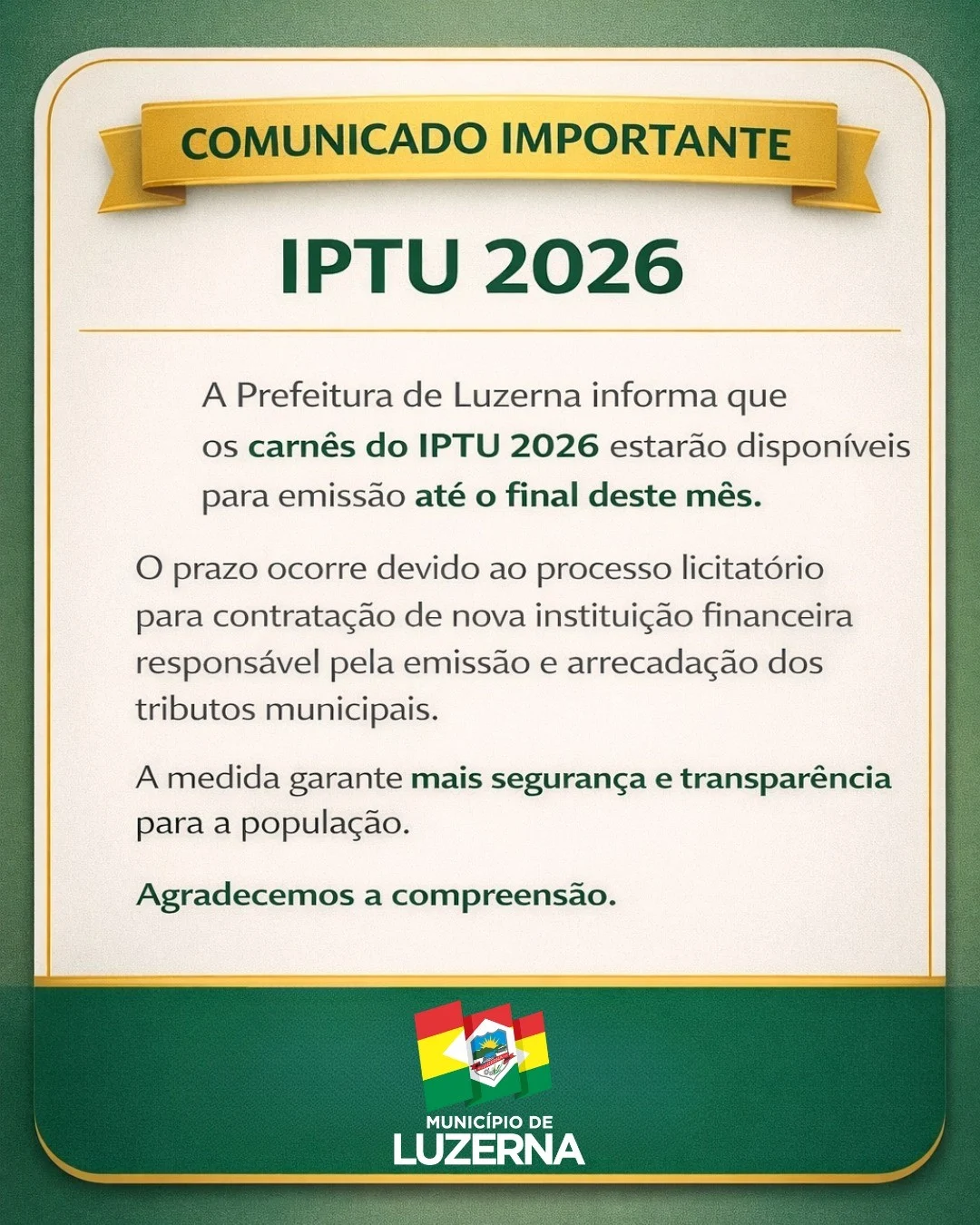 Prefeitura de Luzerna informa que os carnês do IPTU 2026 estarão disponíveis para emissão até o final deste mês.