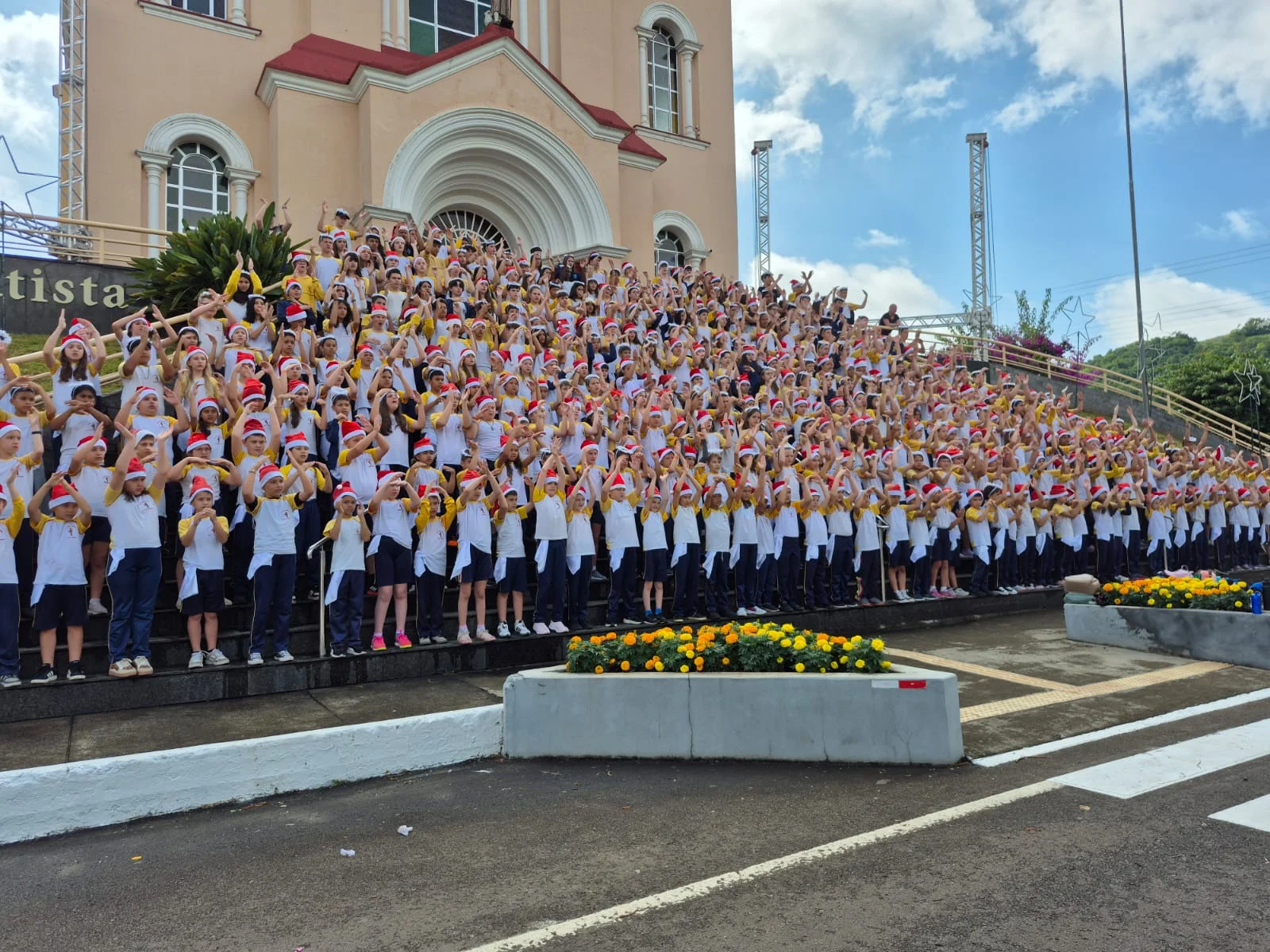 Nos últimos dias, a escadaria da igreja Matriz de Luzerna tem sido palco de intensa movimentação, onde estudantes, professores e equipe de apoio se dedicam aos últimos ajustes do repertório e das coreografias. Cada detalhe está sendo preparado com carinho para oferecer à comunidade um momento especial de celebração do verdadeiro sentido do Natal.
