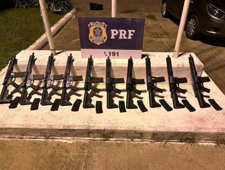 A busca veicular encontrou dentro do tanque de combustíveis e também em um “fundo falso” no teto 10 fuzis calibre 556 desmontados e sem numeração, além de 20 carregadores do mesmo calibre.