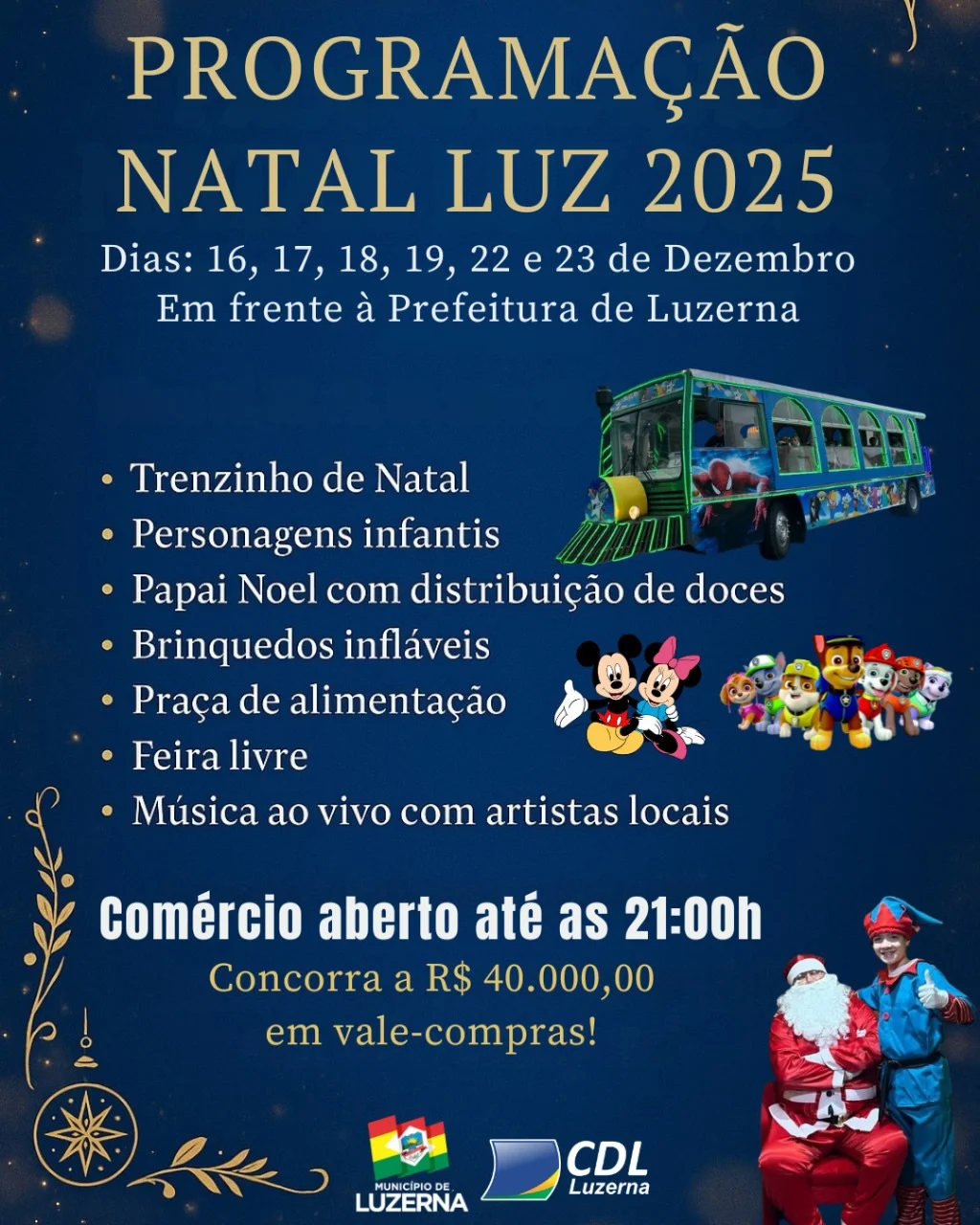 O evento, que é resultado de uma parceria entre o Município de Luzerna e a CDL Luzerna, contará com uma série de atrações voltadas para toda a família, especialmente para as crianças. Entre os destaques estão o Trenzinho de Natal, a presença de personagens infantis, o Papai Noel com distribuição de doces, brinquedos infláveis, além de uma praça de alimentação e a tradicional feira livre.