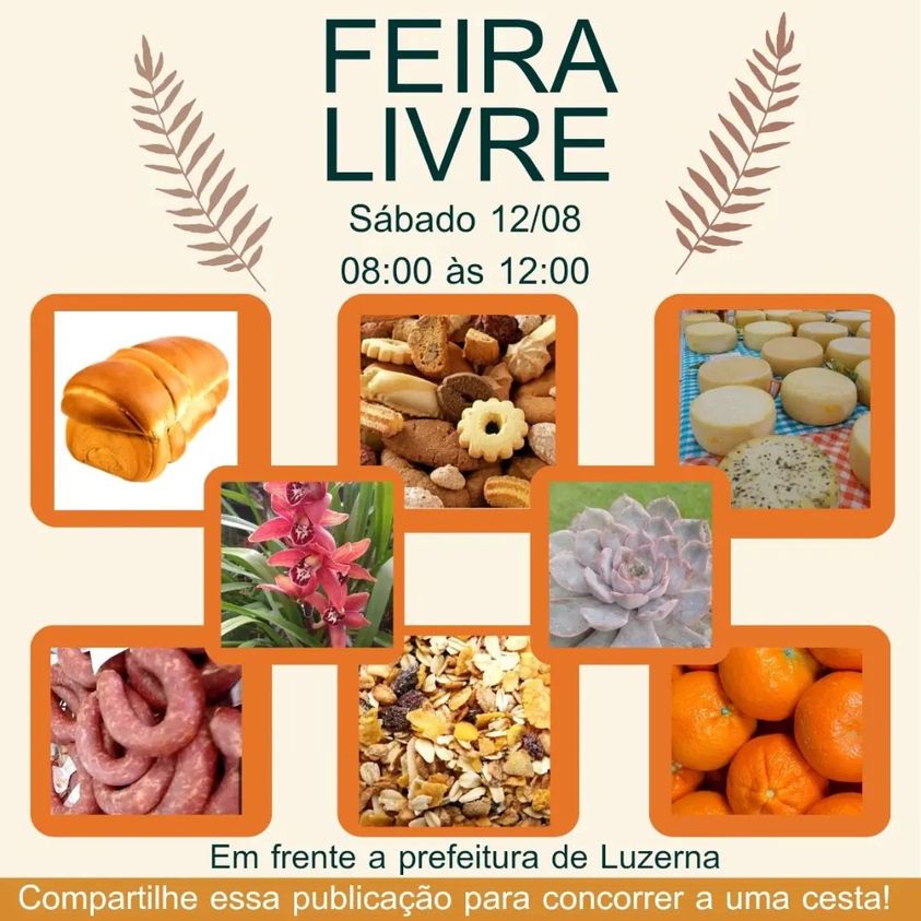 Sábado, dia 12 de agosto, das 08:00 às 12:00, em frente a prefeitura de Luzerna!