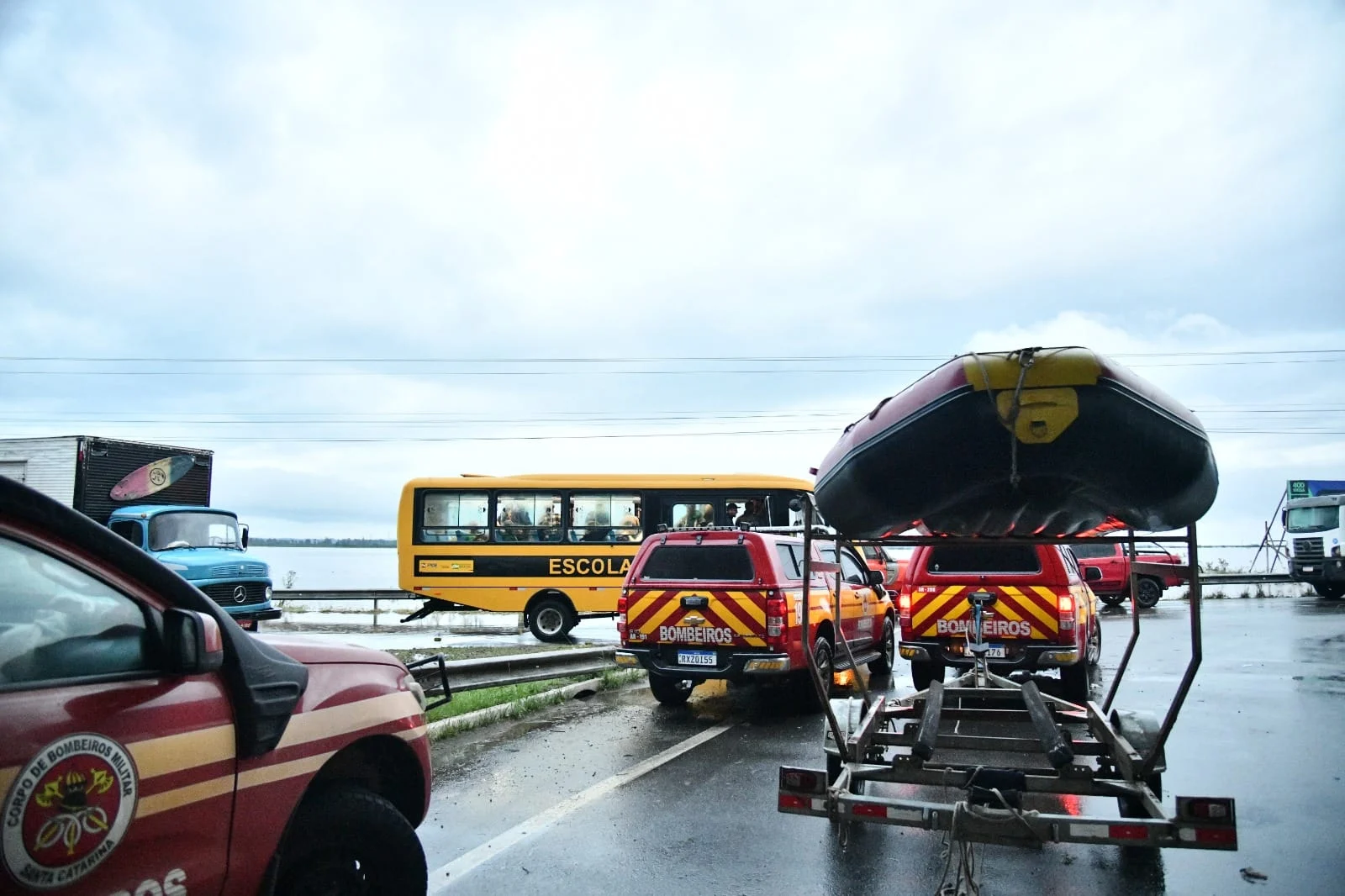 Deslocadas para atuar na região da Grande Porto Alegre no sábado, 04, as equipes do CBMSC receberam durante o deslocamento um chamado de urgência referente a 100 crianças que estavam ilhadas no segundo pavimento de uma escola. Na chegada, por volta das 19h, prontamente se equiparam e iniciaram o atendimento.