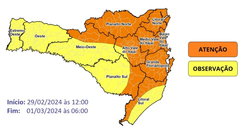 O alerta vai do meio-dia desta quinta até 6h de sexta (1º). Também há risco de raios, rajadas de vento acima de 60 km/h e granizo em todas as regiões, especialmente Oeste, Meio-Oeste, Planaltos Norte, Vale do Itajaí e Litoral Norte.