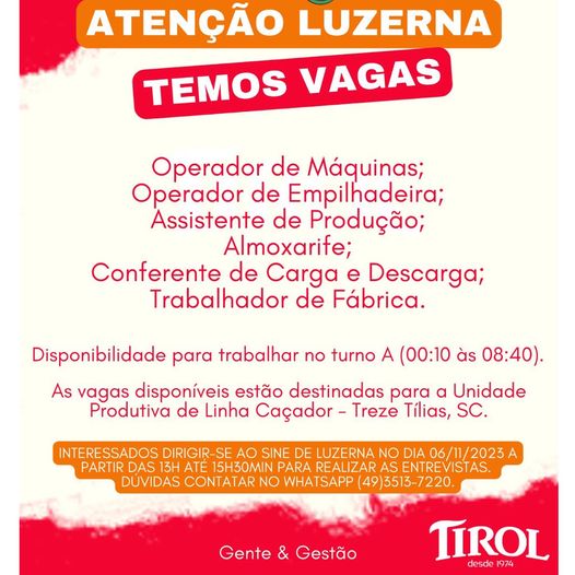 Seleção dia 06 de Novembro no Sine de Luzerna das 13:00h as 15:30h.