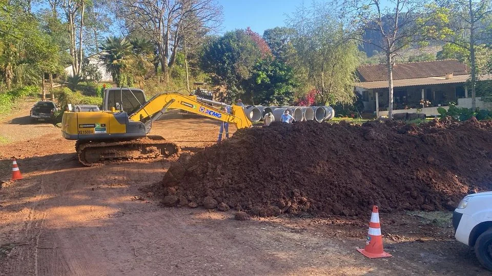 Aproveitando a trégua nas chuvas e visto o grande volume previsto para os próximos dias, está sendo trocada a tubulação que está trancada por uma maior.