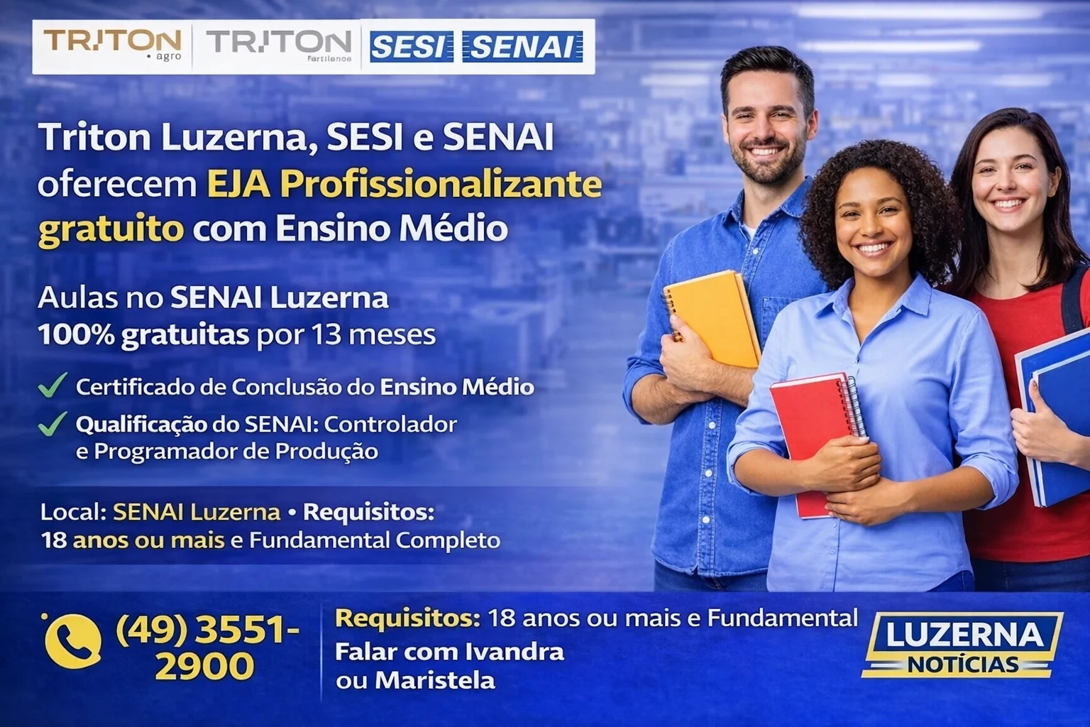 Uma nova oportunidade para quem precisou interromper os estudos e deseja retomar a formação está disponível em Luzerna. A EJA Profissionalizante SESI/SENAI – Triton Agro e Triton Fertilalnce oferecem a conclusão do Ensino Médio integrada a um curso de qualificação profissional reconhecido pelo SENAI — tudo de forma gratuita.