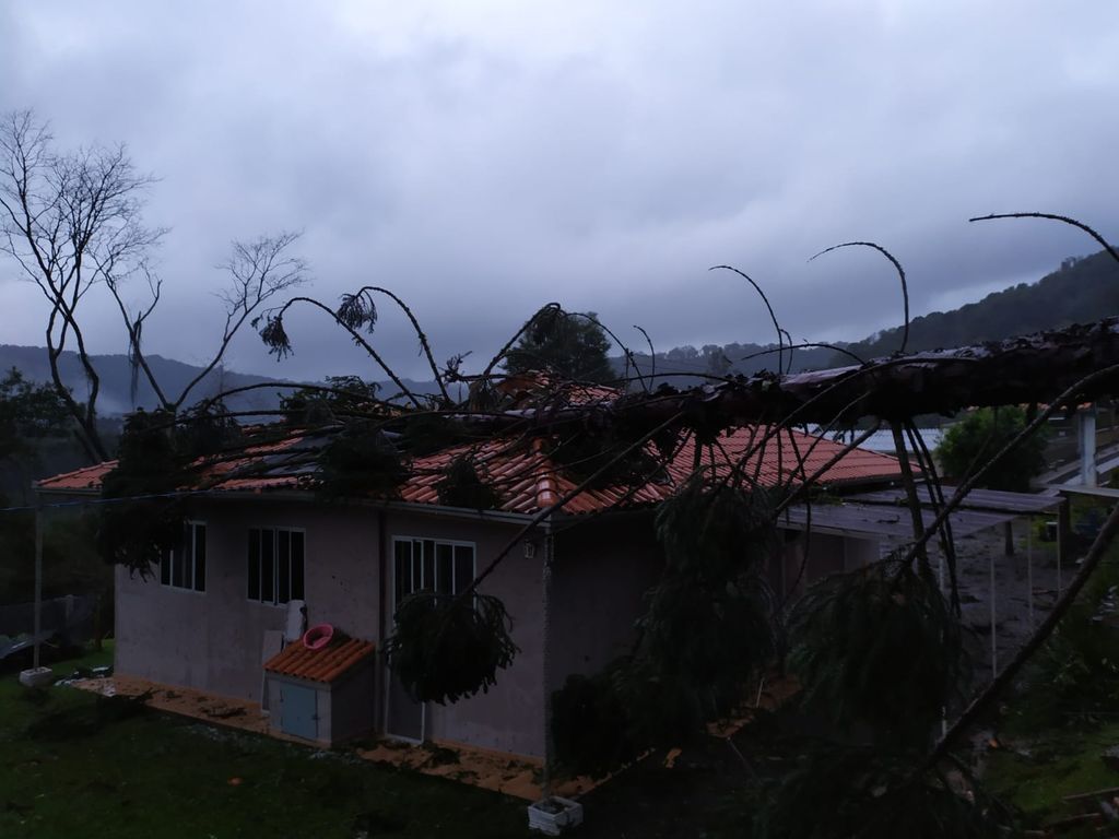 O Corpo de Bombeiros Militar recebeu pelo menos um chamado para atender a uma queda de árvore sobre uma residência também na mesma localidade, por volta das 07 horas. Ela atingiu todo o telhado do imóvel.